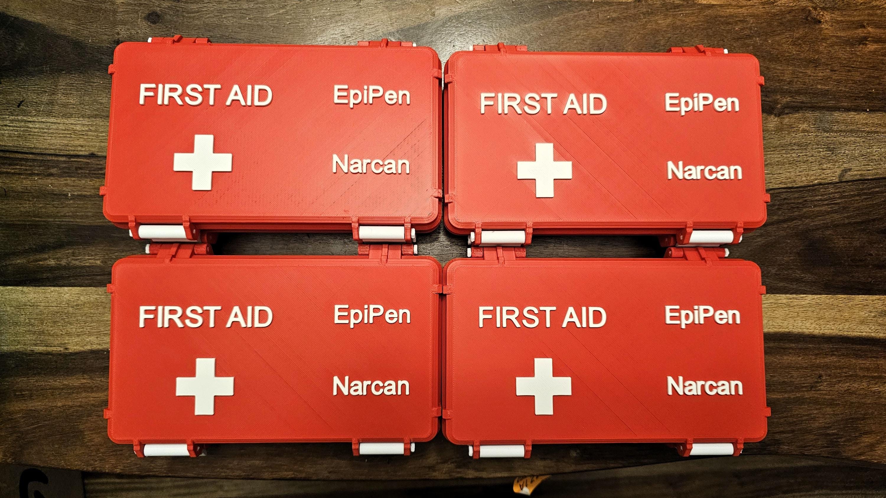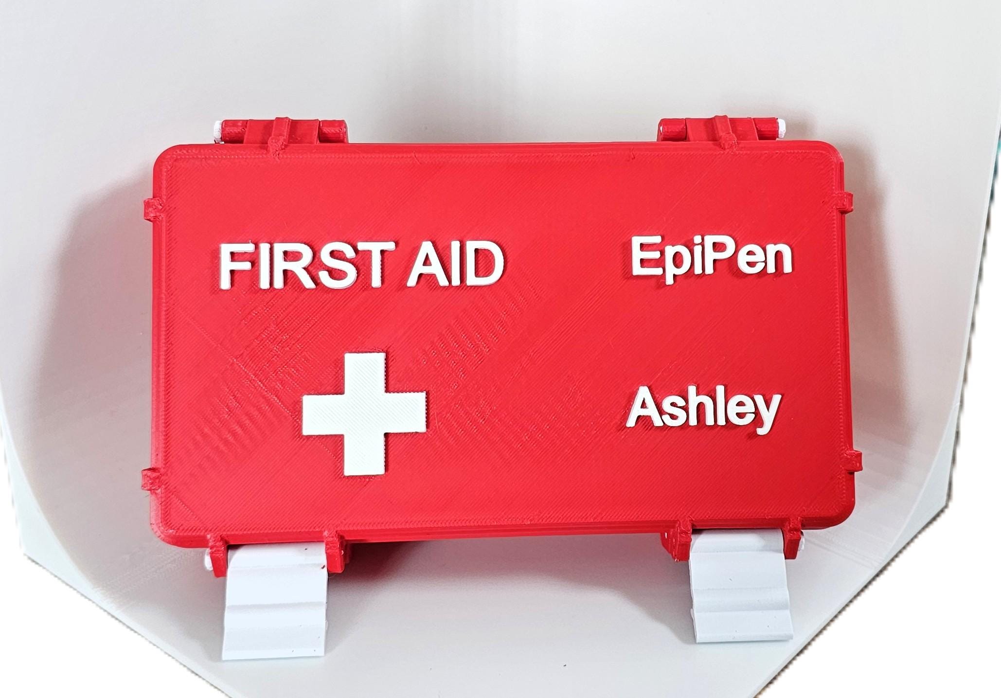 Be prepared for emergencies with this bright red, personalized first EpiPen case! Clearly labeled with "FIRST AID" and a prominent white cross, this sturdy container also features designated spaces for an "EpiPen" and your name, making it easily identifiable in critical moments.